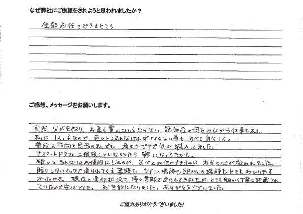 父の死後、やらなければいけない事が多すぎてパニックになっていた時、クロワッサンのムックの裏表誌の広告に、「あなたは日常の大切な時間を取り戻すことに専念して下さい」と書かれていて、本当にそうしたい、是非お願いしたいと思いました。そして何と言っても自宅まで本当に来て下さる事で、心から信頼して安心してお任せすることができました。 阿部先生と直接お話できて本当に気持ちが軽くなりました。