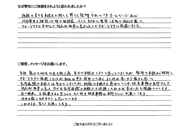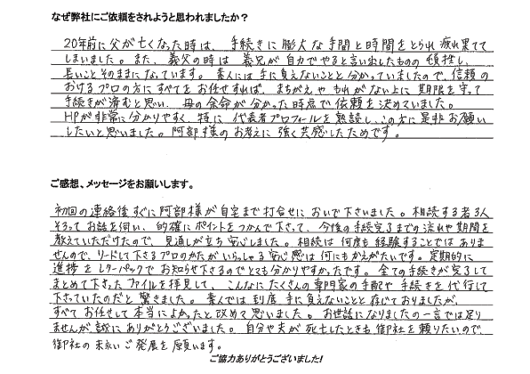 20年前に父が亡くなった時は、手続きに膨大な手間と時間をとられ疲れ果ててしまいました。また、義父の時は、義兄が自力でやると言い出したものの頓挫し、長いことそのままになっています。素人には手に負えないことと分かっていましたので、信頼のおけるプロの方にすべてをお任せすれば、まちがえやもれがない上に、期限を守って手続きが済むと思い、母の余命が分かった時点で依頼を決めていました。
