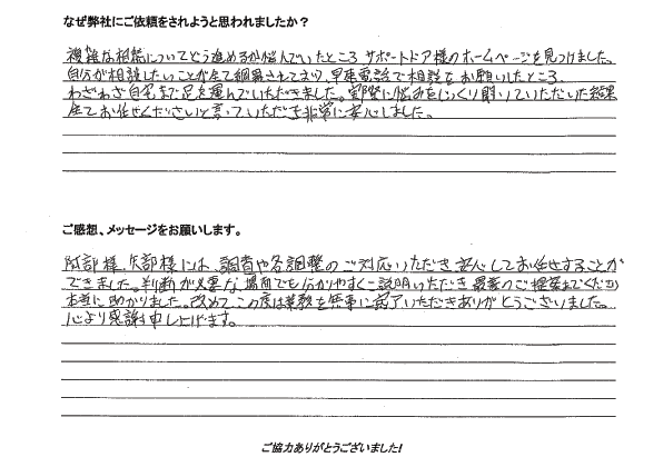 複雑な相続についてどう進めるか悩んでいたところ、サポートドア様のホームページを見つけました。自分が相談したいことが全て網羅されており、早速、電話で相談をお願いしたところ、わざわざ自宅まで足を運んでいただきました。実際に悩みをじっくり聞いていただいた結果、全てお任せくださいと言っていただき、非常に安心しました。