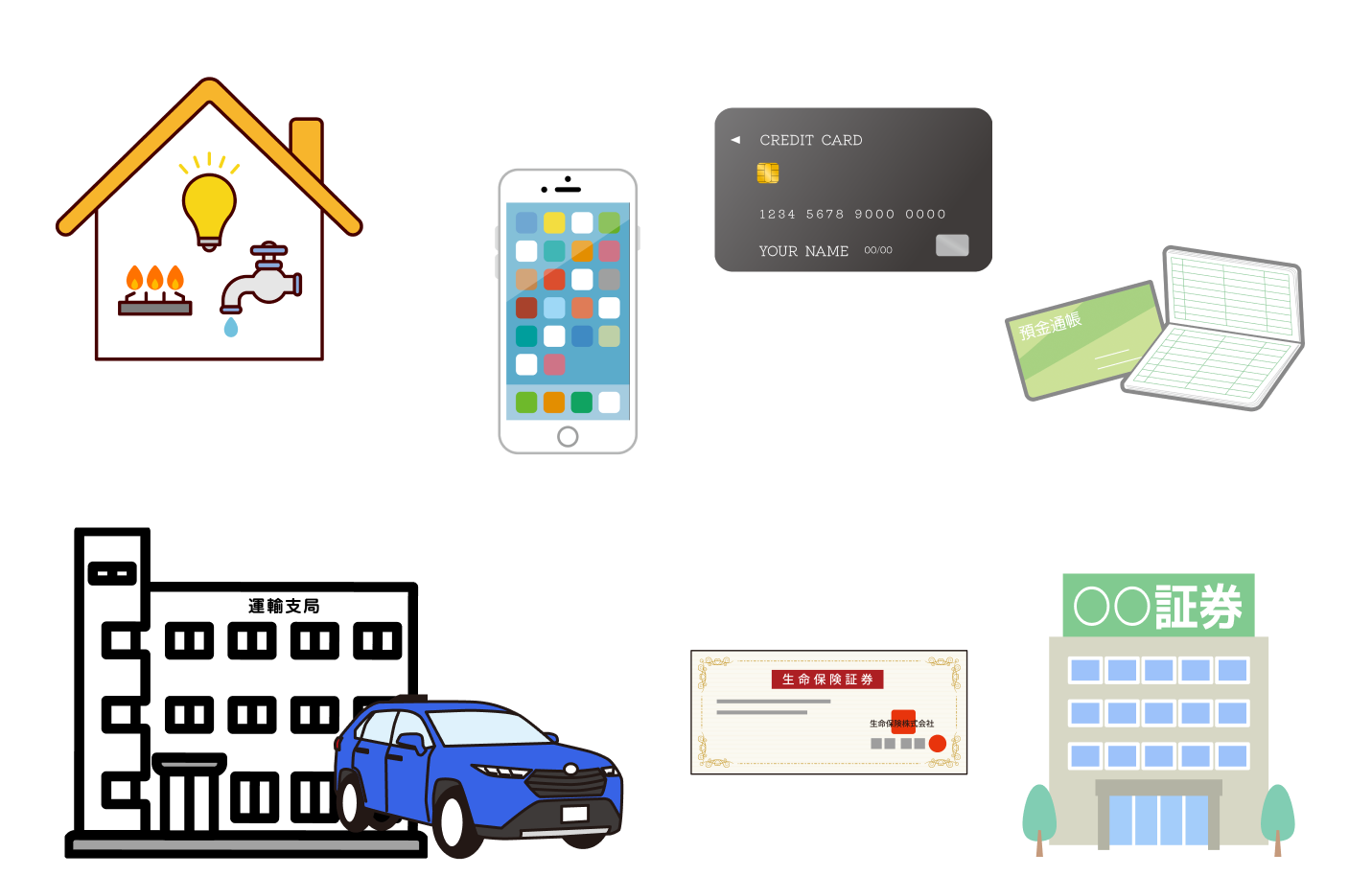 電気、ガス、水道、NHK、固定電話、ケーブルテレビ、インターネット、新聞、サブスク(ネットフリックス、アマゾン、ヤフー会費など)、