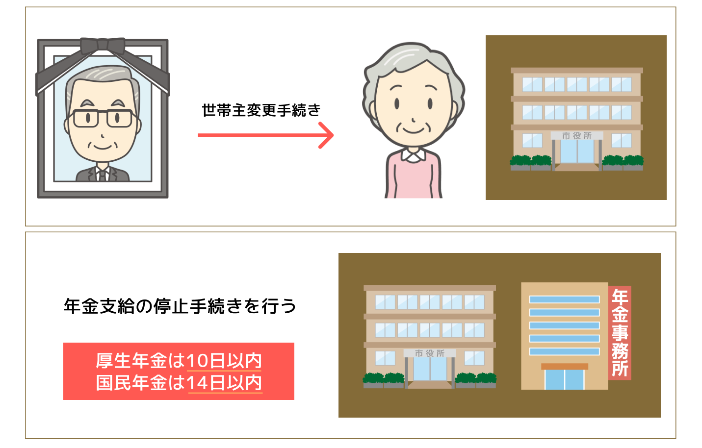 亡くなった方が年金を受給していたときは、厚生年金は10日以内、国民年金は14日以内に、支給停止の手続きをおこないます。