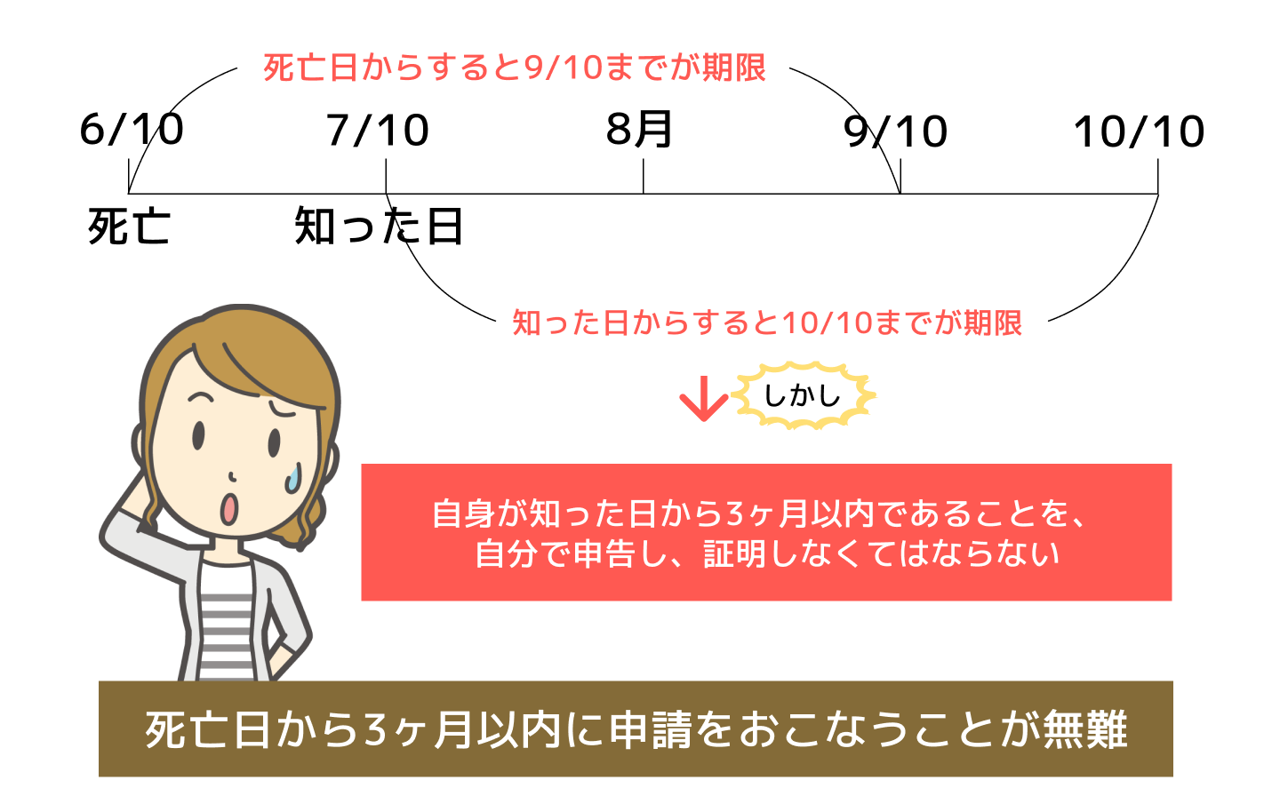 ただし注意が必要で、たとえば10/1に申請をするなど、申請日が死亡日から3ヶ月を経過してしまっているときは、自身が知った日から3ヶ月以内であることを、自分で申告し、証明しなくてはなりません。